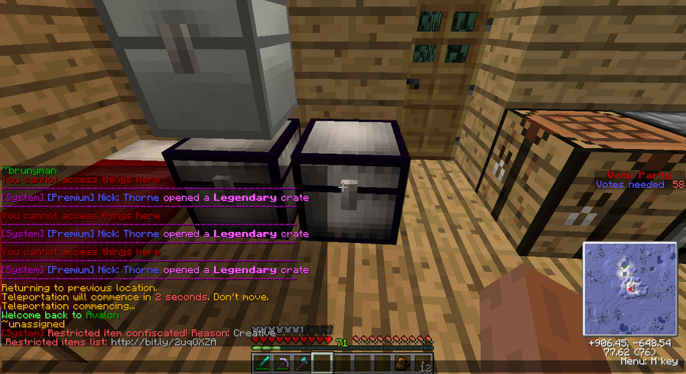 1. Your Name: TheFlyingBaboons Item Name + Amount: 1 Resonant Portable Tank Coordinates: 906, 76, -648 Description of Issue: So, I just did my votes and used up my vote crate keys. Got a total of 3 legendary crate keys, last of which gave me the resonant pack. I /home to get the last of my vote stuff into my chests. My inventory's a bit of a mess, so I press the inventory sort key. One of the resonant items gets picked up by the cursor. I'm like, ok, and put it back into a slot. I press the sort key a couple of times and I hear this breaking noise and one of them is gone. I look in the chat and there's a message saying "[System] Restricted item confiscated. Reason: Creative". So, of course I check the restricted items list because that'd be a strange item to restrict and it's not there. Screenshots (Optional): I know these screenshots don't really show that I had that specific item in the first place, but I don't exactly go screenshotting every crate roll I get I