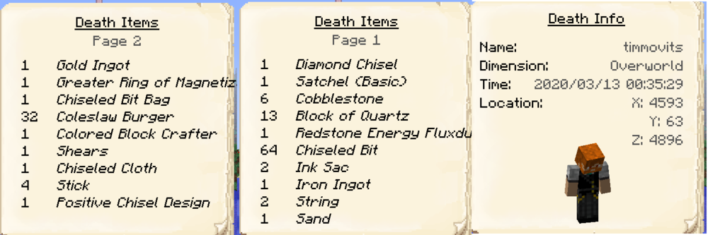 1. Your Name: TimmovitsCoordinates: x:4593 Y: 63 z;4896Time/Date (Post a time/date when everything was fine) (day/month/year): 13/03-2020 00:35 Danish time (gmt +1)Description of Issue: i died in a fire made untop a netherrack near Mskarens home, and no gravestone was placed, most of what i lost can be replaced, but i lost a greater ring of magnetism and my tools which will be dearly missed.Screenshots (Optional):