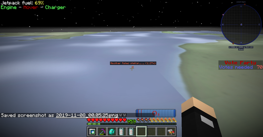 I built my first space station on the server according to the quest book. However, upon “arriving” I realized both my space ships (one to make the station, and one to go there myself) were gone. I was free-falling through space towards earth. Around the Y coordinates 500 Earth disappeared. After falling a few hundred blocks into a void, I saw my station a good 10 blocks in front of me. Using my jet pack I reached it. I flew 1,000 blocks away from my station with the jet pack to find earth, and found I couldn't return to my station the same way I came. There was some kind of barrier. I used the /home to return but I could not return to the station. The /back says the location is unsafe to go to.
