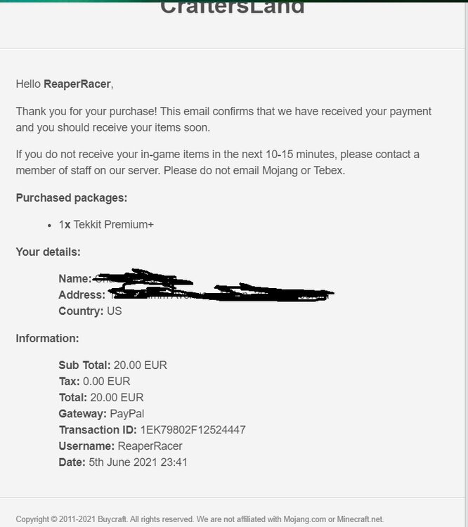 1. In game name: ReaperRacer Proof of Purchase: see attachment Description of Issue: Upgraded to Premium + Date/Time of Purchase: June 5th, 2021 19:41 EST Items/Rank Bought: Premium + Screenshots (Optional): see attached Any other important information: Proof of purchase includes: PayPal Receipts, Transaction ID, and The Confirmation Email you received