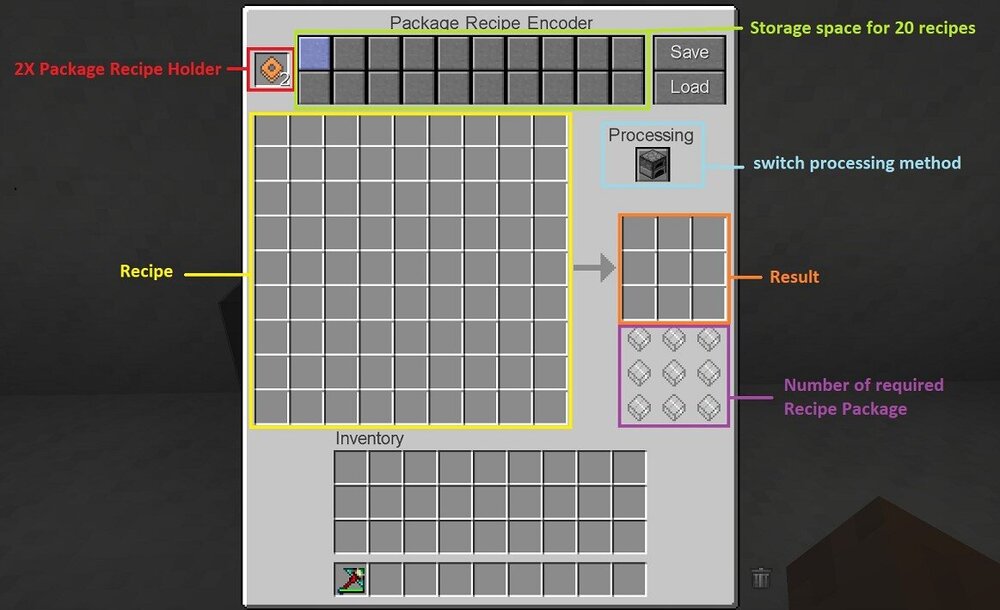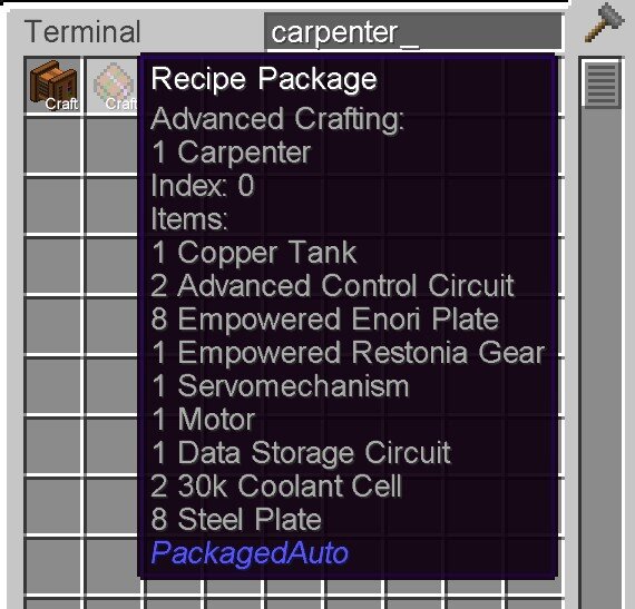 Small extended autocrafting guide To create recipes in autocrafting with the size 5x5, 7x7 or 9x9 you have to use the mods PackagedAuto and PackagedEXCrafting. You will need the following to start: 1 Package Recipe Encoder, 2 Package Recipe Holders, 1 Packager, 1 Unpackager and depending on what you want to craft an Advanced, Elite or Ultimate Package Crafter. Or a crate into which the items are exported to craft them manually (Draconic Evulution, Mage / Jeweler's Workchop or something else). A Packager, Unpackager and Package Crafter make a crafting unit that can craft 20 different recipes of one type (Advanced/Elite/Ultimate). Per unit 2 channels to the ME controller are needed. In the Package Recipe Encoder the recipes are created and stored in the Package Recipe Holder. Set the Processing Mode to what you want to craft, for example Advanced. Select what you want to craft with "Move Items". Make sure you don't have any exotic chests or chiseld items in the recipe. Then save the Recept and put one Recipe Holder in the Packager and one in the Unpackager. Now the item should be "orderable" in the ME. You will see the Carpenter and the Recipe Package in the ME. The Recipe Package is only important for crafting and not for ordering. If you order the item you will get like in normal autocrafting displayed what is needed. 9x9 Extreme Crafting of Avaritia can only be automated via Refined Storage or via the detour if you unpack the items in a box and then manually craftet in the crafting table! I hope it helps a little bit and is understandable In my base are currently the 320 of me most frequently used recipes automated.