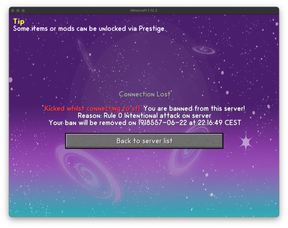 I don’t have the exact timeline anymore; I was disconnected and later found I was permanently banned under Rule 0. I did not intend any attack. Could you share the relevant logs or details (time, location, contraption) so I can see what triggered this?
