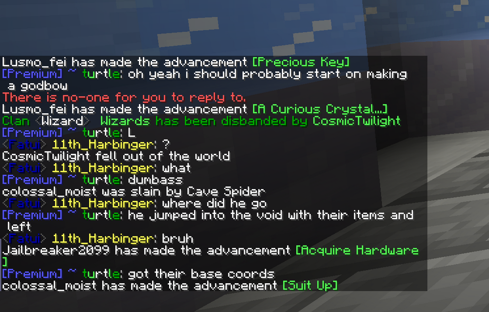 2. Your Name: 11th_Harbinger Coordinates: 4240, 70, 3348 Time/Timezone/Date (Post a time/timezone/date when everything was fine): 1:45 pm CDT 6/23/2022 Description of Issue: Got tpakilled right as the server reset and all my stuff stolen, he then took all of my items and jumped into the void with them. Zeroth tried to help me out, but he can't do rollbacks and told me to get one through here. Screenshots (Optional): Chat logs of the suicide attached, conversation was had in the Discord server and in game. Buhru and turtleboi182 tried to help, but he was uncooperative in returning the items that he stole.
