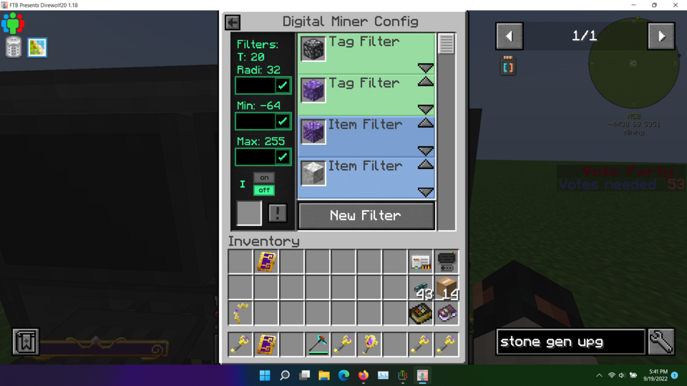 Hello admins. I'm experiencing a weird set of problems involving the digital miner from Mekanism. I have my config for the miner set to silk certain blocks and replace them with stone in a 32 block radius from the miner from build height to bedrock.