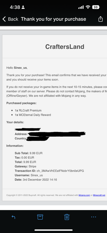 2. In game name: Sinex_us Proof of Purchase: Description of Issue: Meant to get the Mc eternal premium Date/Time of Purchase: 3rd Dec 2022 14:16 Items/Rank Bought: RLC Premium Screenshots (Optional): Any other important information:
