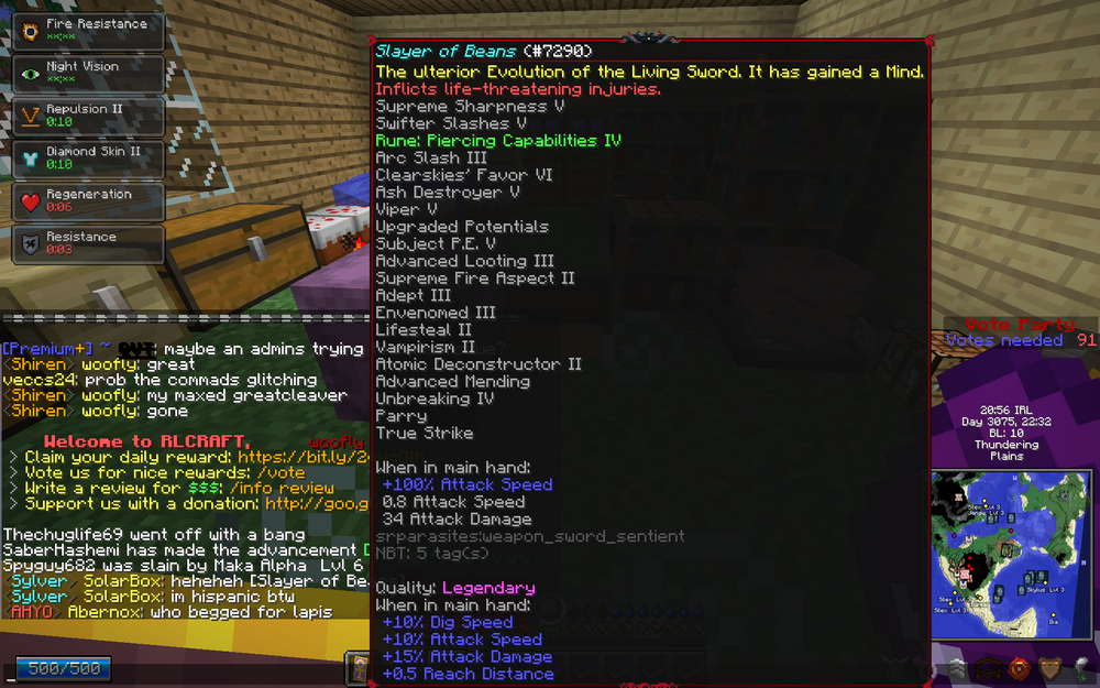 2. Your Name: Woofly Item Name: Sentient Greatcleaver + ID: srparasites:weapon_cleaver_sentient + Amount: 1 Base Coordinates: -2656 64 -1665 Description of Issue: Lost my maxed sentient greatcleaver (enchants see below) when it was in an anvil and the server crashed Legendary quality with all of the enchants in image except: Clearskies favor, parry and true strike. Also had a rainbow rune but not as fussed about that.