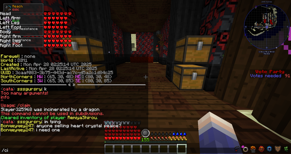 4. Your Name: RemiyaShirou Coordinates: end bunker, malign's one to be specific Time/Timezone/Date (Post a time/date when everything was fine): 1:24:44 am CEST Description of Issue: was trying to see how many claimblocks i had and thought /ci stood for claim info, turns out it stands for clear inventory instead and i had no idea. Witnesses: ____Ali(in call, screensharing) Screenshots (Optional):